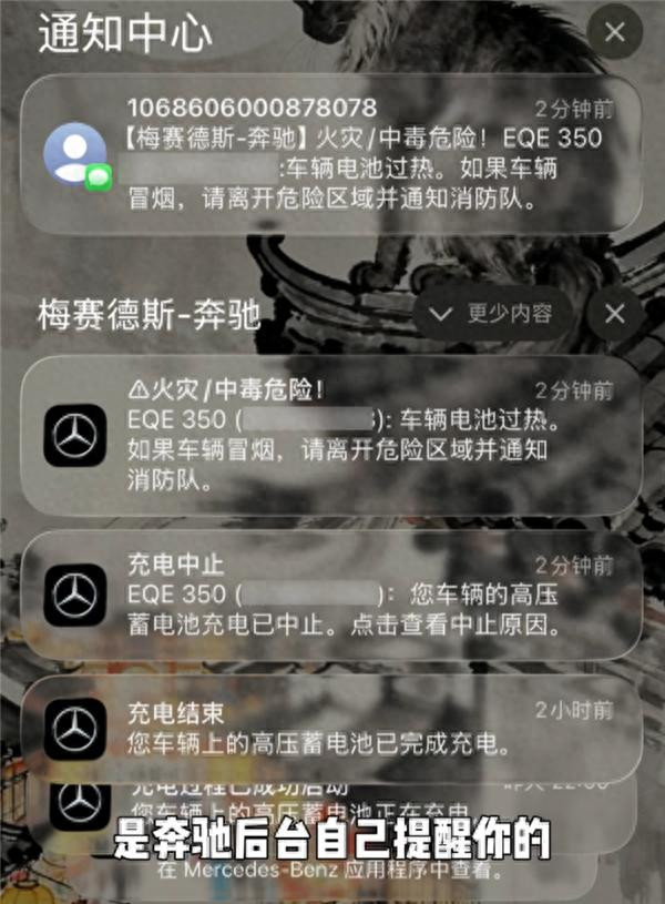 起火事故发生后,奔驰的APP和短信还给他推送了车辆热失控信息,“车辆电池过热,如果车辆冒烟,请离开危险区域并通知消防队”。